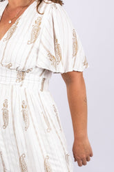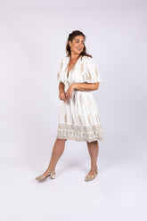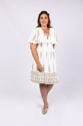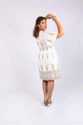 שמלה לבנה עם עיטורי זהב מודפס, גזרה מחמיאה עם כיווצים במותן, גומי בגב ובטנה לבנה