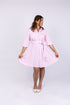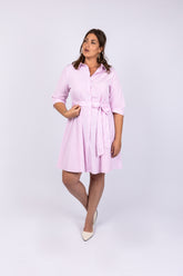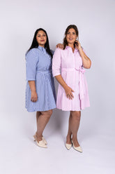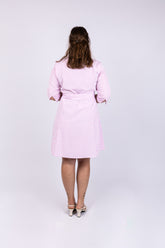 שמלת פסים מכופתרת בגזרת A, עם סרט קשירה במותן ושרוול שניתן לכפתר לאורך מרפק